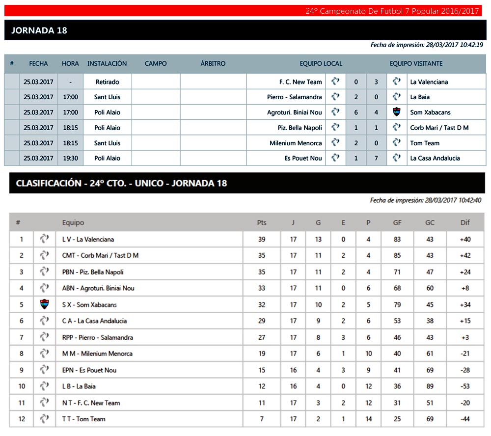 La Valenciana aprovechó – en la la 17ª jornada de Liga del 24ª campeonato de Futbol-7 Popular- el empate de sus perseguidores Pizzeria Bella Napoli y Corb Mari/Tast D.M. (1-1) para aumentar la ventaja en la tabla gracias a su ‘victoria’ debido a la retirada del del F. C. New Team (3-0). La jugueteria ya cuenta con cuatro puntos por encima del segundo y tercer clasificado. Buena renta para el sprint final, aunque ni muco menos decisiva.