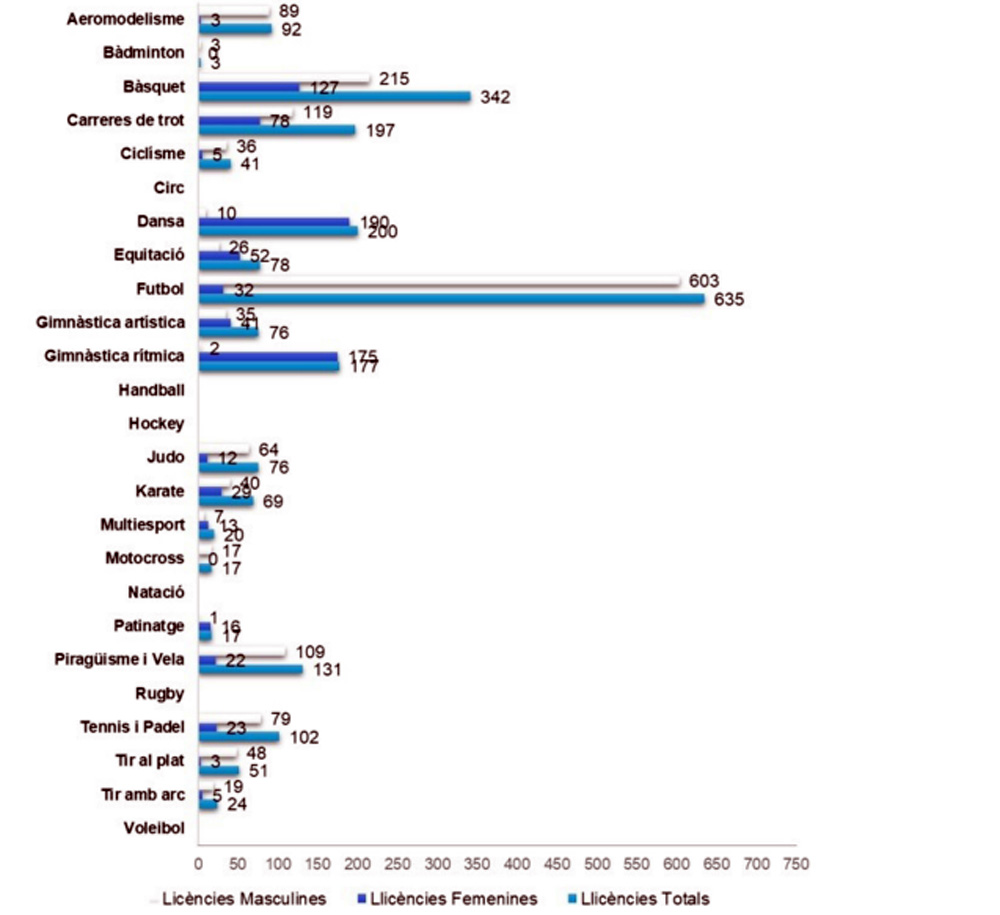Cal destacar que sovint ses diferents modalitats esportives presenten una clara diferenciació segons es gènere, que es fa molt evident en esports com es futbol, que compta 603 llicències masculines per només 32 llicències femenines, o en sa gimnàstica rítmica, que compta amb 175 llicències femenines per només dues de masculines. De ses 342 llicències des bàsquet, 215 són masculines i 127 femenines.