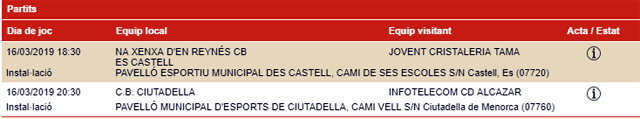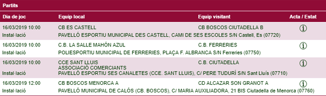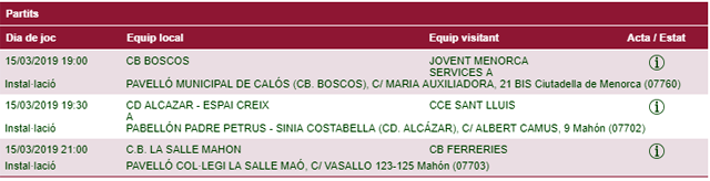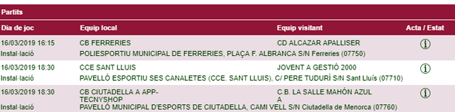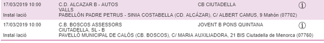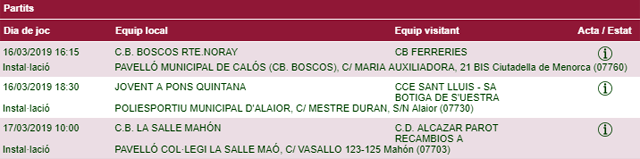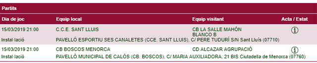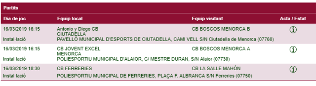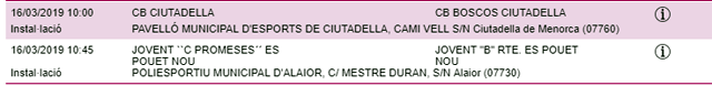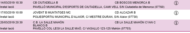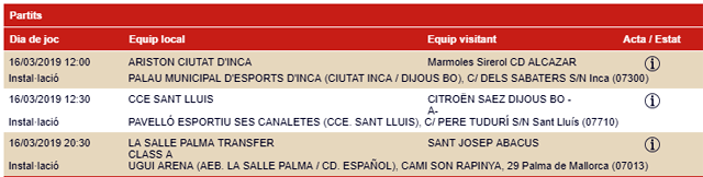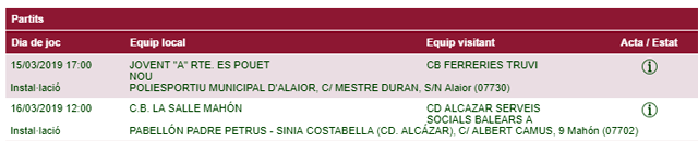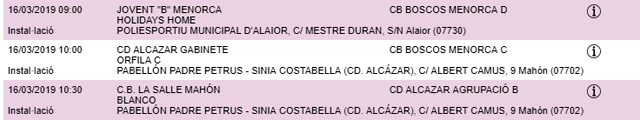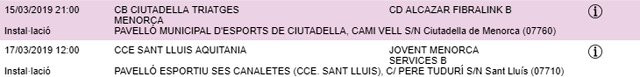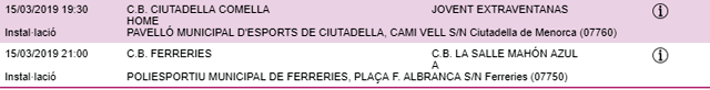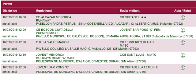Horarios facilitados por la Página Web de la Federació de Bàsquet de ses Illes Balears, sujetos a posibles cambios de última hora.