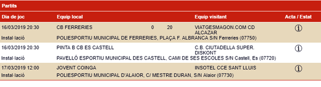 El partido que se debía jugar en Ferreries, entre el CB Ferreries y el CD Alcázar ha sido suspendido, por la retirada de la competición del equipo blaugrana, dando como ganador, 0-20, al equipo de Sa Sinia Costabella.