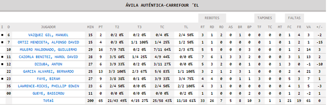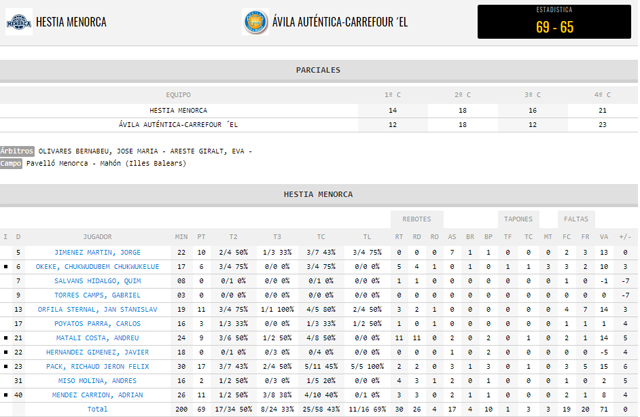 Pack y Matalí fueron los mejores jugadores de los menorquines, con 17 puntos, el exterior y 11 rebotes el jugador catalán, en un partido en el que también fueron decisivos jugadores como Méndez, con triples en momentos decisivos, Orfila y Jiménez. Por parte visitante, Mulero fue el máximo anotador, con 16 puntos, de un equipo que plantó cara y puso en apuros la victoria menorquina en los minutos finales, rebajando hasta a tres puntos una ventaja que era de 13.