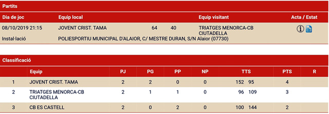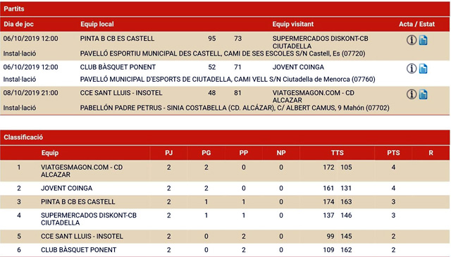 En Ciutadella se enfrentaban el CB Ponent y el CB Jovent, con victoria para los visitantes, 52-71. La salida de los de Alaior marcó el resto del partido, un 0-8 inicial allanó el camino de la victoria para los visitantes. Ya a al finalización del primer cuarto dominaban por 13 puntos, 7-20, con un muy buen trabajo defensivo. El Ponent, tras ver como al inicio del segundo acto el Jovent se iba hasta los 18 puntos, reaccionó, logrando estrechar el marcador hasta los 9 puntos, pero de ahí no pasó, ya que los visitantes volvieron a recuperar el terreno perdido, dejando el partido encarrilado al descanso, 19-33.