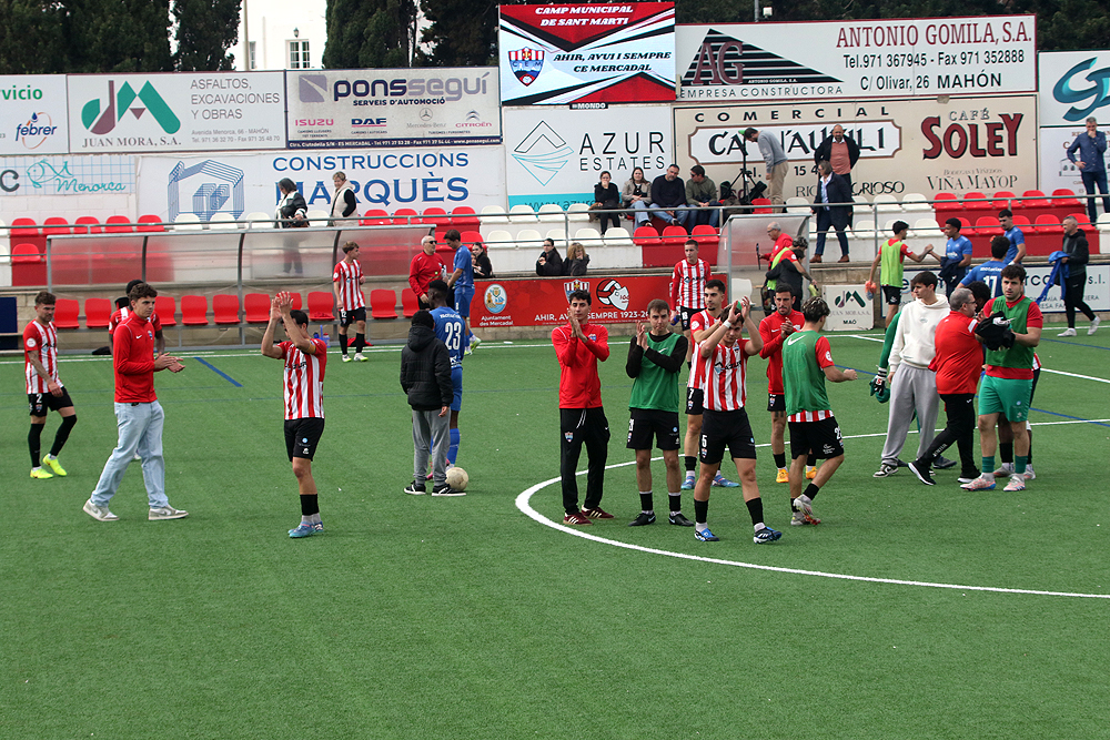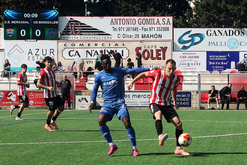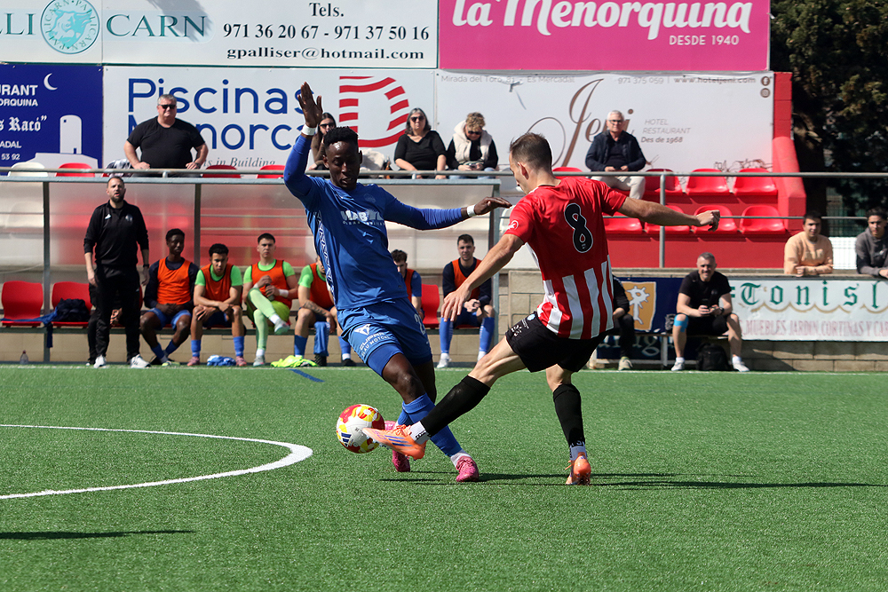 El duelo ha enfrentado a dos equipos que arrastran un déficit común, la falta de gol aunque el Mercadal ha sabido rentabilizar los 22 que ha marcado por su equilibrio en defensa -el tercero que menos recibe- mientras el decano del fútbol balear es el peor ofensivamente hablando con tan solo 16 dianas. Con estas premisas, el partido ha transcurrido por unos derroteros de máxima igualdad en la primera mitad, con alternativas en el juego pero sin que ambos equipos generaran situaciones de gol.